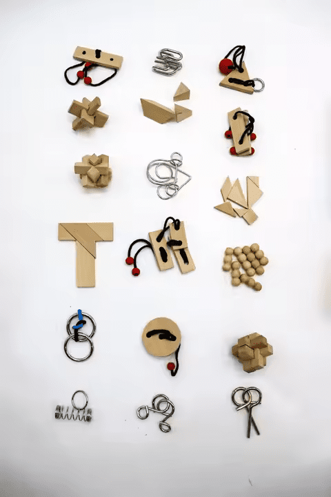 A mix of wire, logic, string, and tactile brain teasers